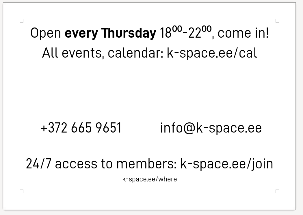 /open-<name per sign here>-doorinfo@k-space.ee//+372 665 9651(dial group, please wait)Locations